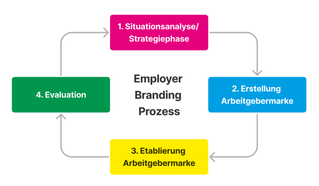 Der Employer Branding-Prozess der HTWK besteht aus vier Schritten: Analyse, Erarbeitung der Arbeitgebermarke, Etablierung der Marke sowie die Evaluation und Optimierung. Dieser fortlaufende Zyklus stellt sicher, dass die Arbeitgebermarke stetig weiterentwickelt wird, um attraktiv und authentisch zu bleiben.